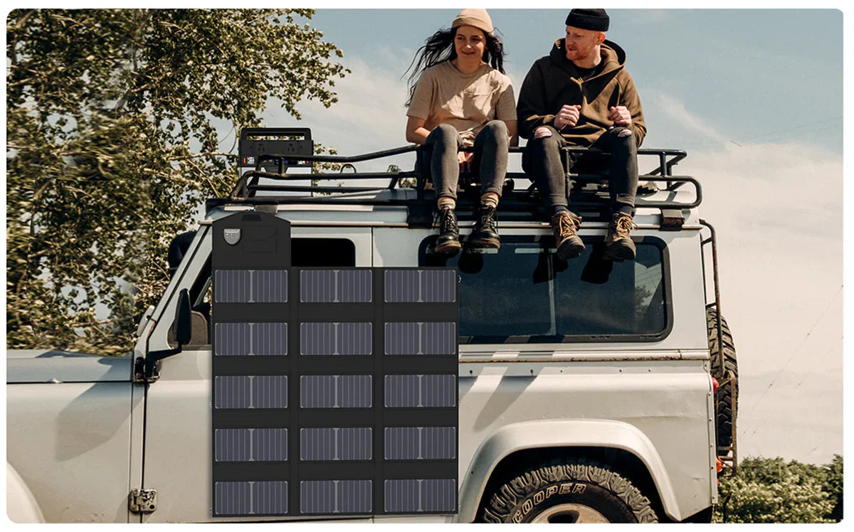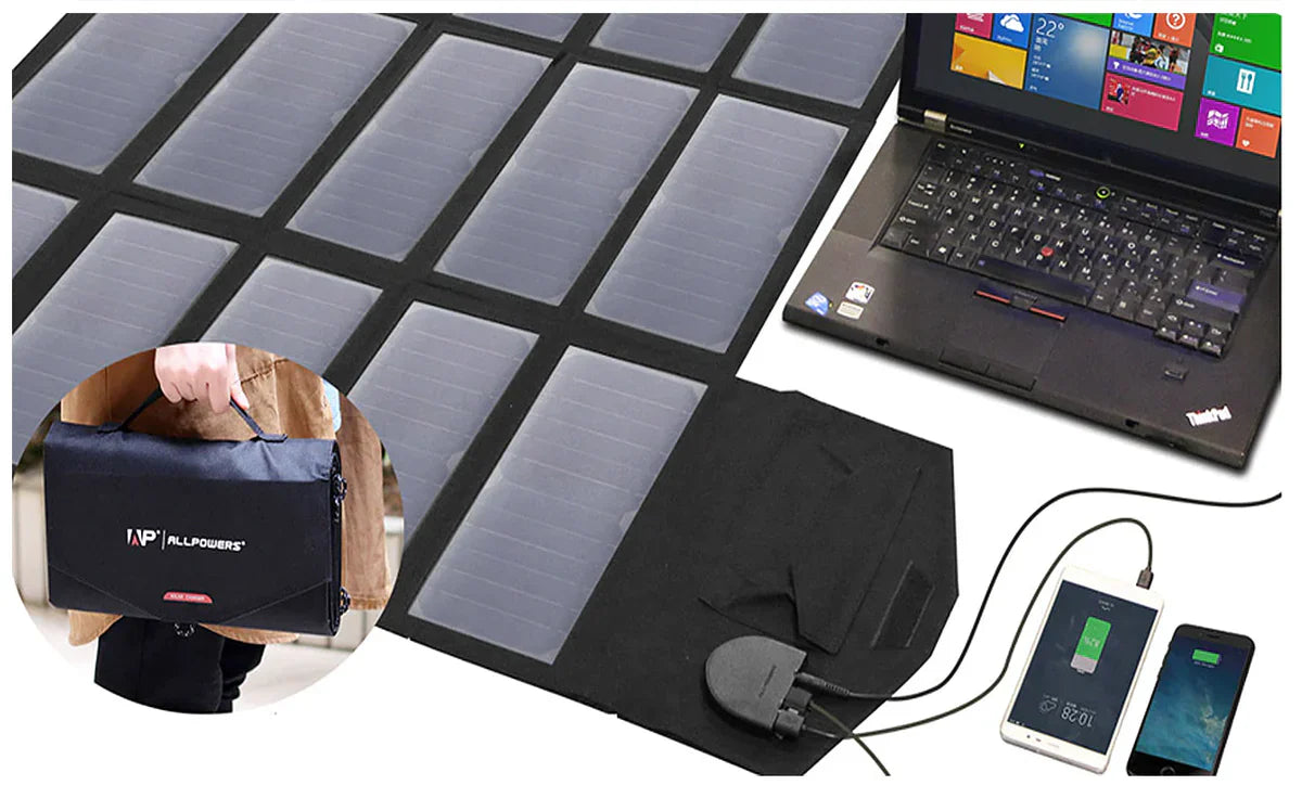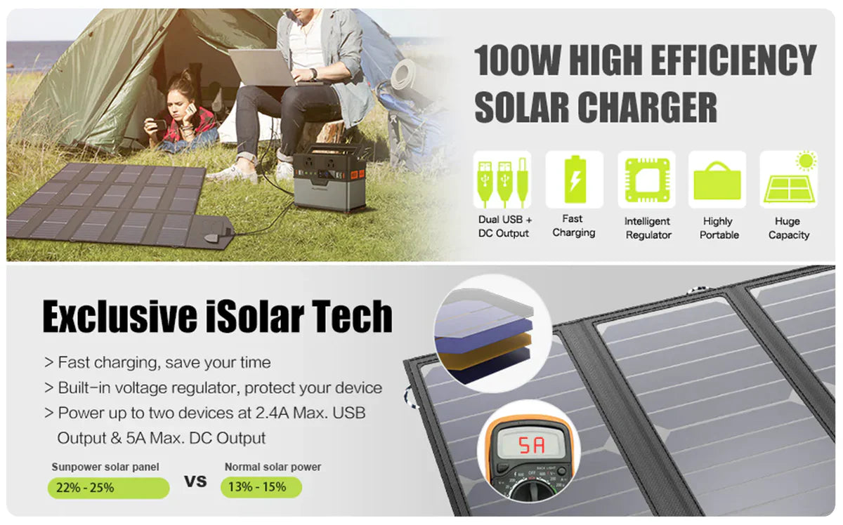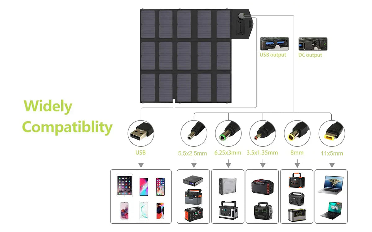 Ausgestattet mit dem Dual-USB-Ausgang ist das 100W-Solarpanel hochkompatibel mit Telefonen, iPads und anderen Geräten. Sie können es auch mit der ALLPOWERS S200/S300/S700 tragbaren Powerstation verbinden.