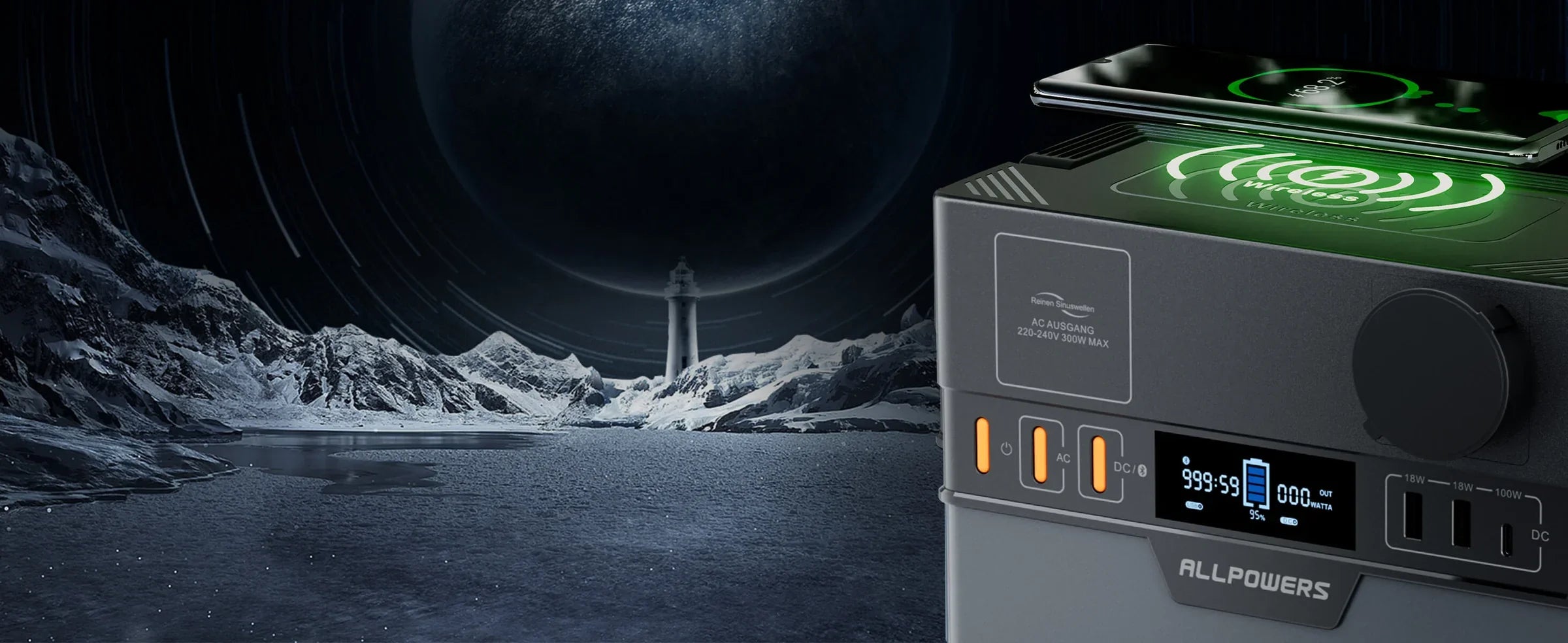 Die ALLPOWERS S300 Plus tragbare Powerstation verfügt über einen 288-Wattstunden-Akku. Die tragbare Stromquelle bietet 1*AC-Anschlüsse (220V-240V), 300W (Spitze 600W), 2*USB-A-Anschlüsse, 1*USB-C-Anschluss, 1*Zigarettenanzünder (12V/8,5A) und einen kabellosen Lader (5V/1A) oben. Die Allpowers tragbare Powerstation bietet Ihnen die Anschlüsse, die Sie benötigen, um alle Ihre Geräte gleichzeitig zu laden.