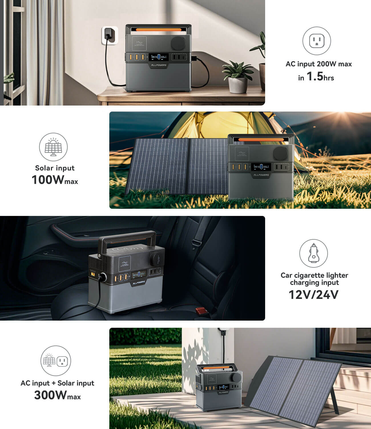 Die ALLPOWERS Portable Power hat 4 Möglichkeiten, die Notfallbatterie zu laden. Es dauert 1,5 Stunden, um die tragbare Powerstation mit einer 230V-AC-Steckdose vollständig zu laden; etwa 3-4 Stunden mit einem Solarpanel bei direkter Sonneneinstrahlung (100W max); etwa 3-4 Stunden mit einem 12V/24V-Zigarettenanzünder; etwa 1 Stunde mit AC-Ladung und Solarpanel zusammen (300W max).