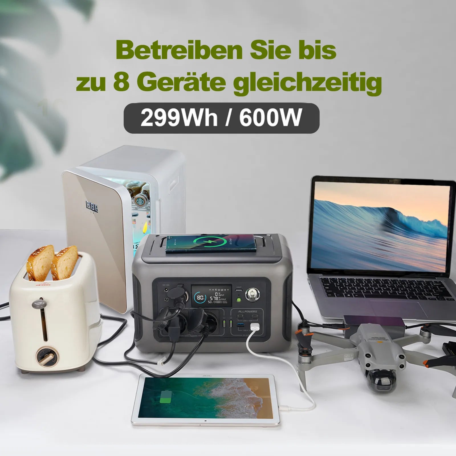 Die ALLPOWERS tragbare Powerstation verfügt über 2* AC-Ausgänge (220V-240V 600W, 1200W Spitze), 2* USB-C Anschlüsse, 2* USB-A Anschlüsse, 1* Zigarettenanzünder (12V/10A) und eine 15W Wireless-Charging-Funktion. Mit einer Ausgangsleistung von bis zu 600W ist der ALLPOWERS R600 speziell für das Laden von Wasserkochern, Entsaftern, Laptops, Kühlboxen, Drohnen und anderen Elektronikgeräten im Freien konzipiert - sorgenfreie Energie für Ihr Outdoor-Abenteuer.