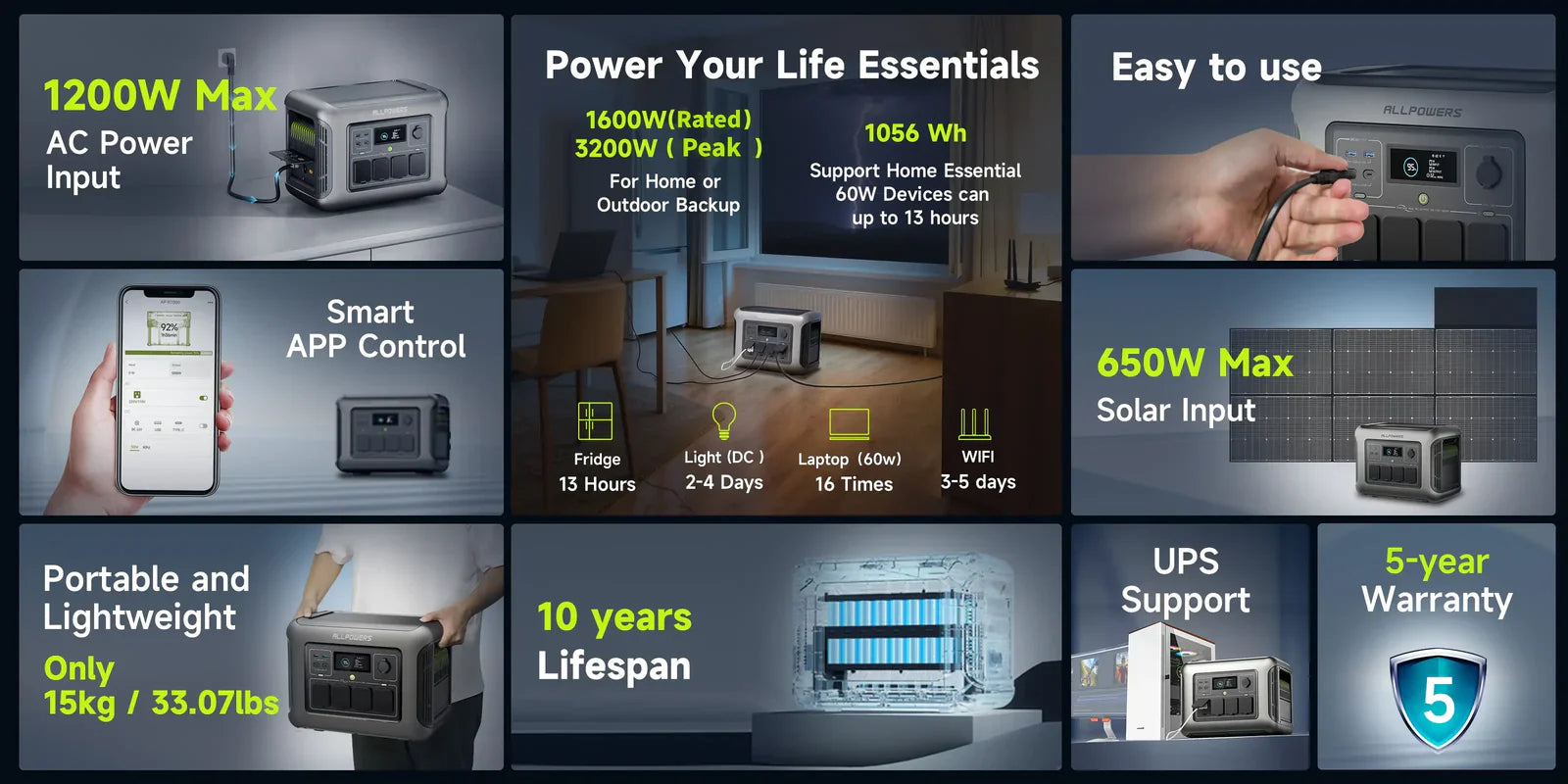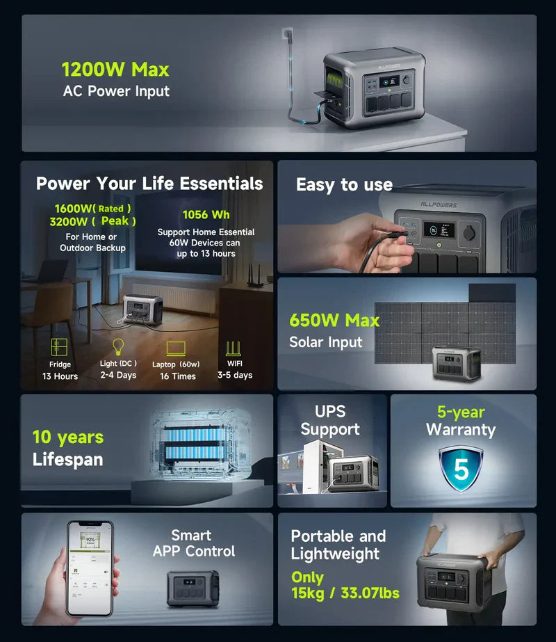 ALLPOWERS R1500 Lite Tragbare Powerstation | 1600W 1056Wh