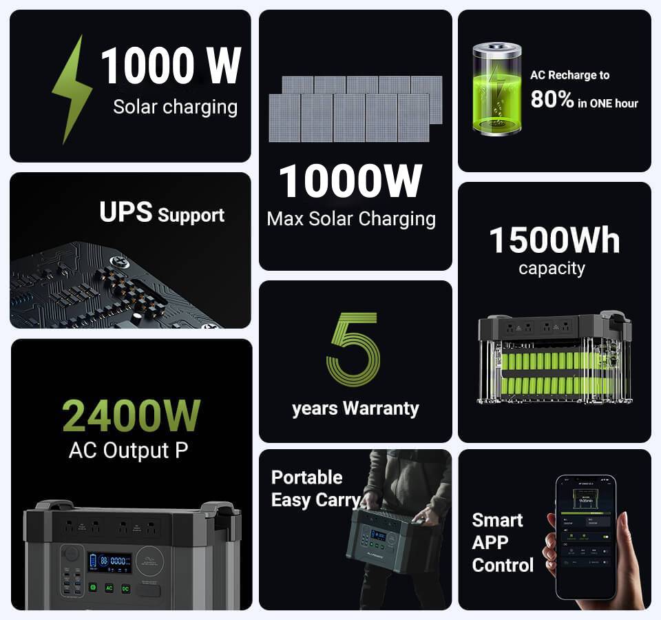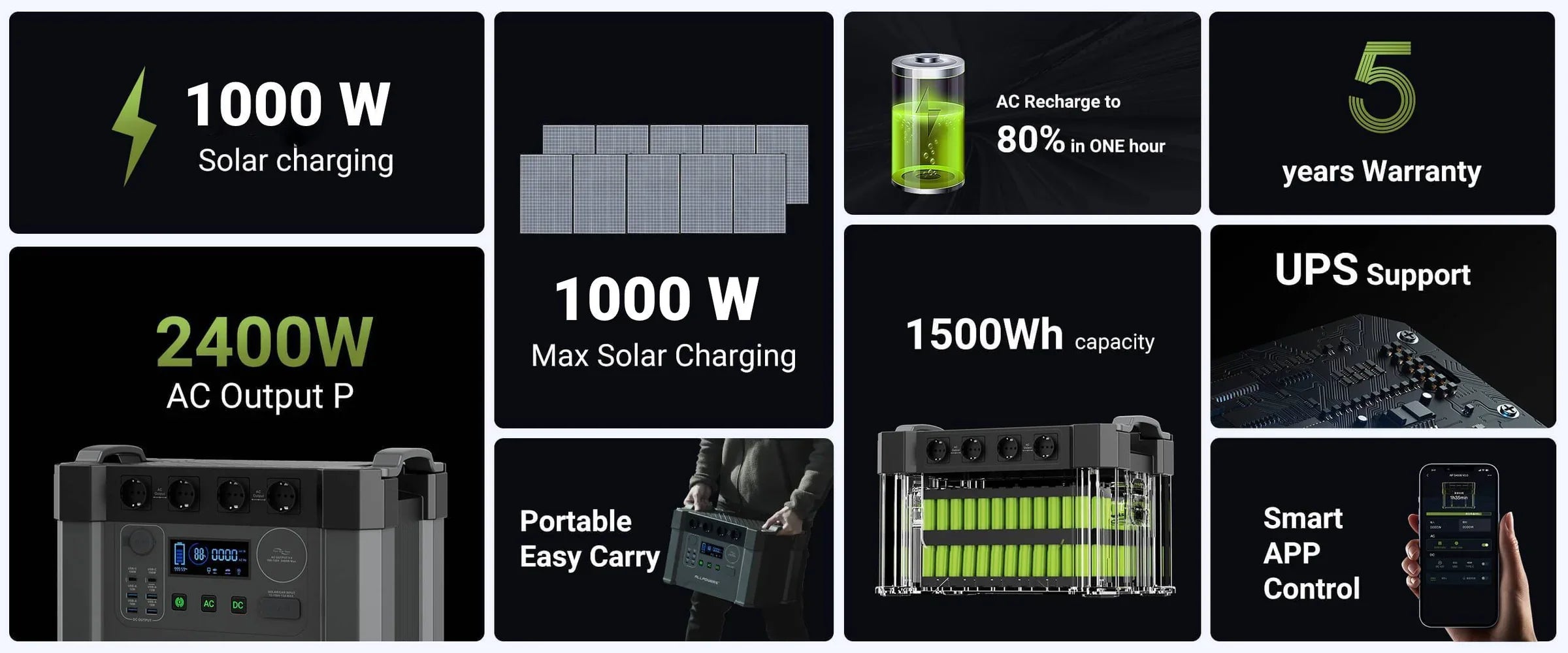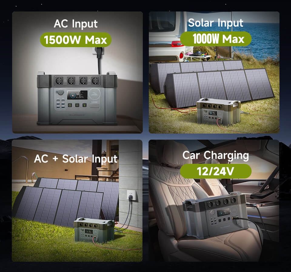 - Aufladung von 0-100% in 1,5 Stunden (AC+Solar Eingang);