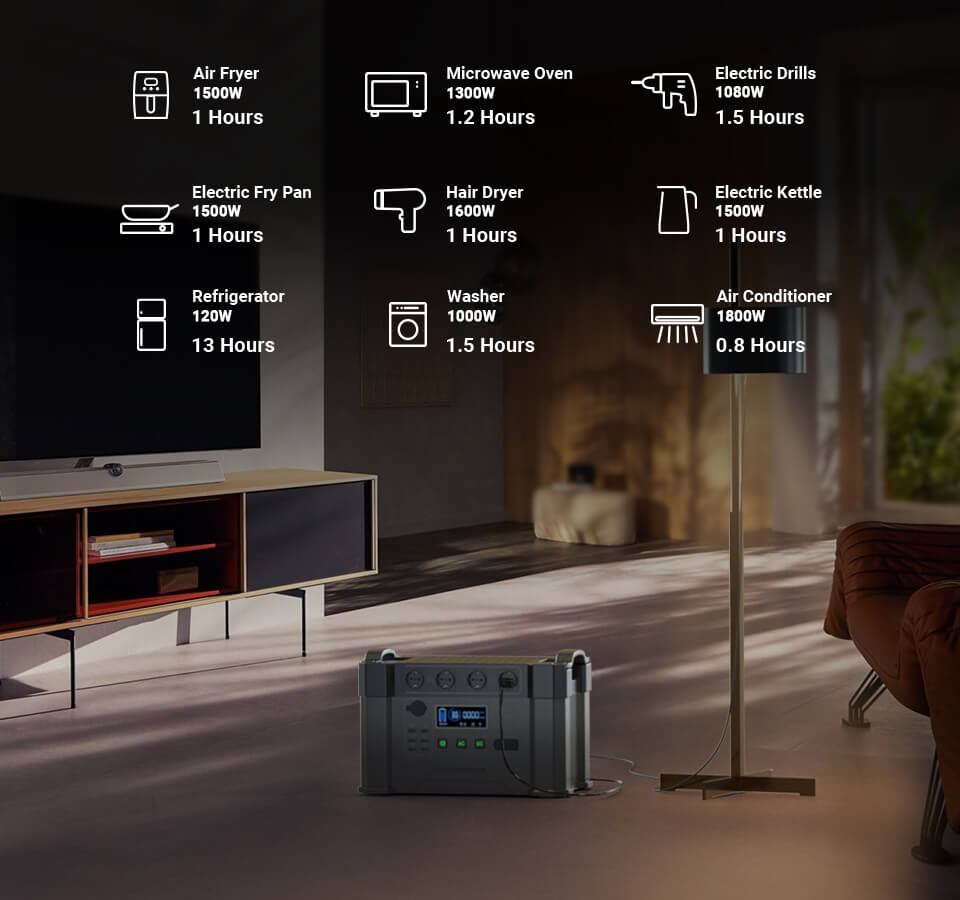 Mit der S2000 pro sind Sie immer gut auf Stromausfälle vorbereitet. Dies ist die beste Backup-Quelle bei Stromausfall. Es arbeitet geräuscharm und ist wartungsfrei. Schließlich kann es Ihnen genug Strom liefern, um Ihre wesentlichen Haushaltsgeräte zu betreiben. Wie Kühlschrank, Kaffeemaschine, Elektrogrill, elektrische Säge usw.
