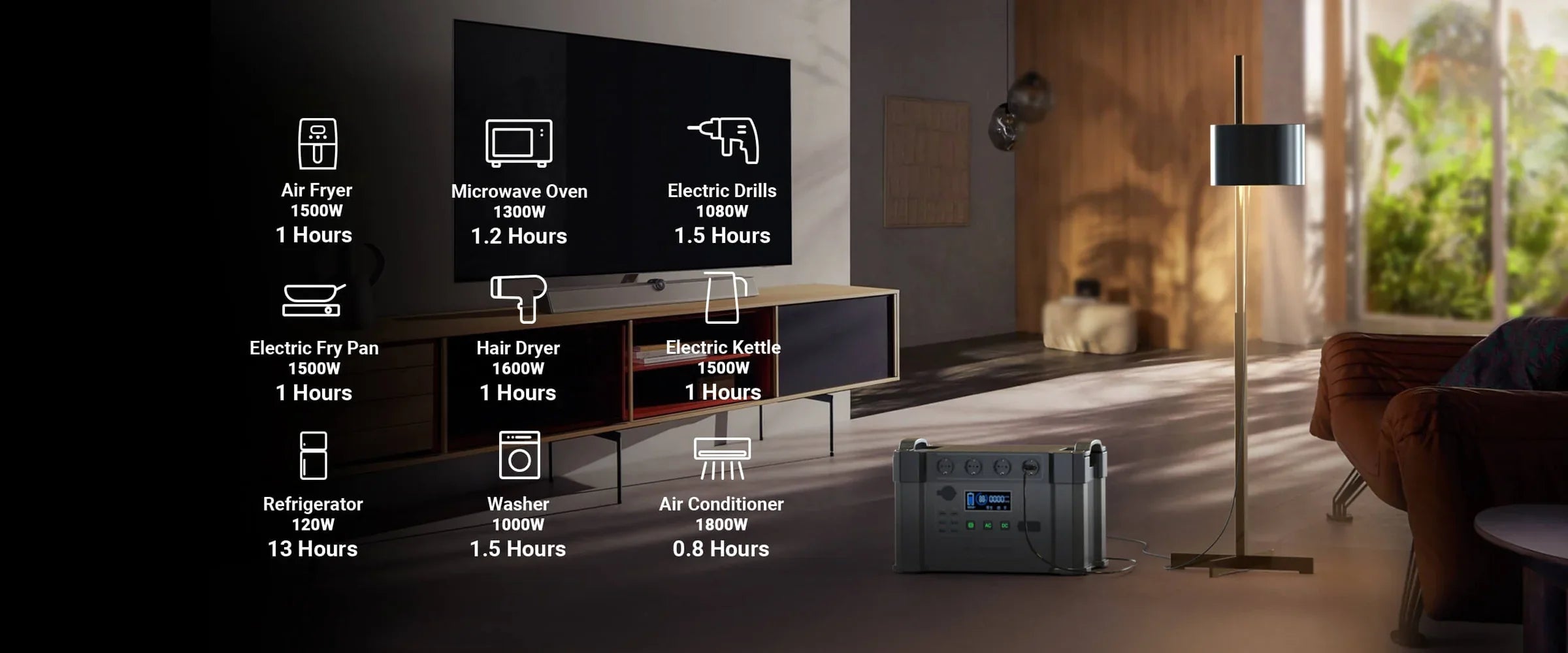 Die S2000 pro verfügt über eine bemerkenswerte Kapazität von 1451Wh und eine Ausgangsleistung von 2400W, wodurch sie 99% der Haushaltsgeräte betreiben kann. Sie können sie für die Stromversorgung der meisten Werkzeuge und Geräte bei Outdoor-Aktivitäten und häuslichen Notfällen verwenden, was Ihnen in jeder Situation Sicherheit gibt.