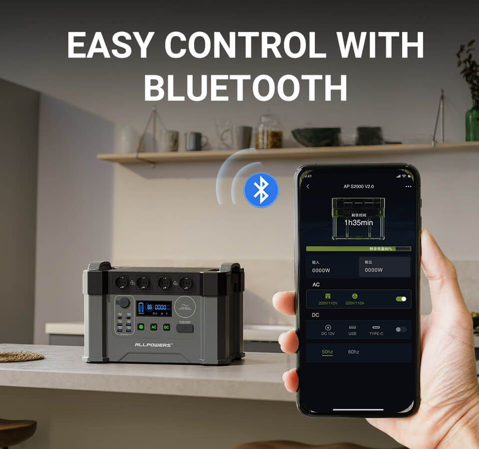 ALLPOWERS tragbares Kraftwerk unterstützt Bluetooth-Drahtlosverbindung mit der ALLPOWERS APP. Bluetooth-Technologie in Stromgeneratoren bietet eine stabile und fortschrittliche Erfahrung für die Fernsteuerung von Solargeneratoren fast überall, sogar bis zu 10 Meter entfernt. Durch das LCD-Display und das Smartphone können Sie auch den verbleibenden Batteriestand/Input/Output des Kraftwerks genau bestimmen.