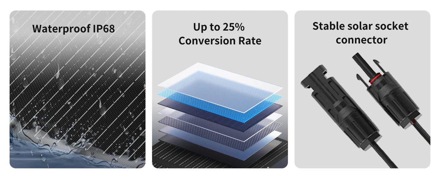 Mit 25% Umwandlungseffizienz beschleunigt das Panel das Aufladen erheblich und nutzt die Sonnenenergie effektiv.