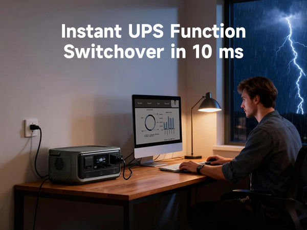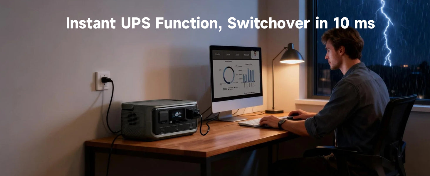 Zintegrowany UPS (zasilanie awaryjne) przełącza się w zaledwie 10ms. Chroni komputer, router i dane przed utratą w przypadku awarii prądu. Niezbędne przenośne zasilanie UPS do domowego biura.