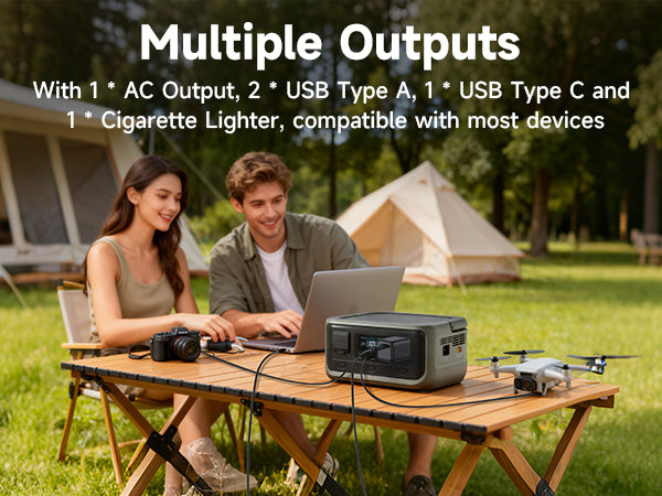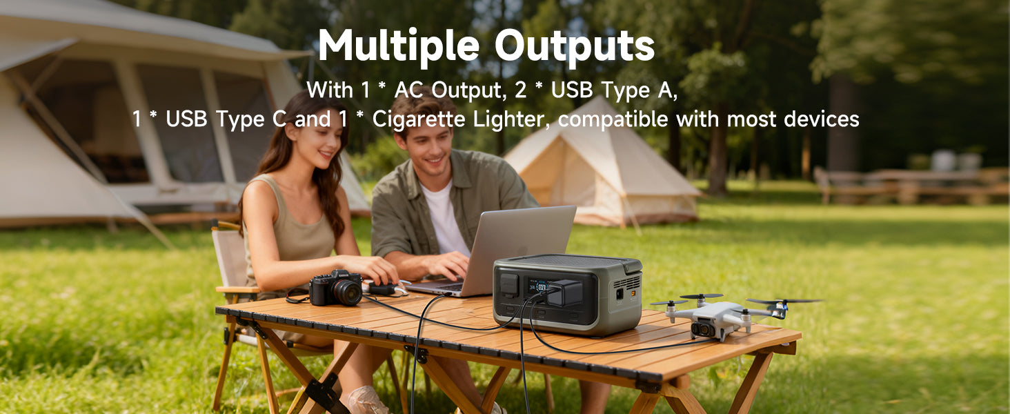 Nasza wieloportowa stacja zasilania wyposażona w AC, USB-A, Type-C i gniazdo samochodowe obsłuży laptopa, kamerę, drona i telefon. Z mocą 300W zapomnij o kolejce do ładowarek. Idealne zasilanie awaryjne do domu i na biwak.